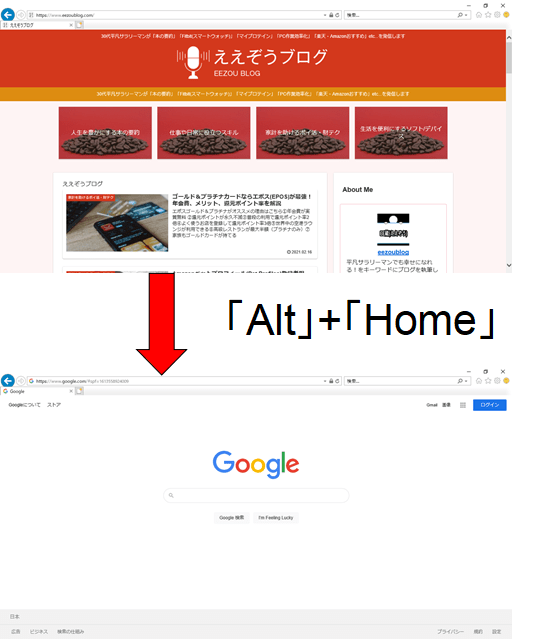 「Alt」+「Home」を押すことで、今開いているタブでホームページに素早く移動できます。