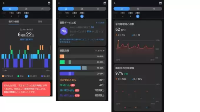 健康機能機能の一例として、睡眠の分析結果を見てみましょう。睡眠時間・睡眠スコア・睡眠の深さの分析・睡眠中の心拍数の推移・睡眠中の血中酸素の推移と、かなり細かい分析ができています。睡眠に悩みがある人にとって、十分な分析結果を提供してくれます。