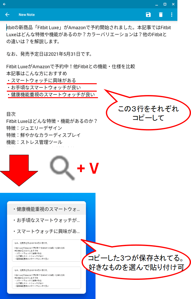 Windowsパソコンでは「Windows + V」でクリップボードを開くことができます。クリップボードには、過去にコピーした履歴データが残っており、ここから好きなものを選択して貼り付けることができます。ただの貼り付け(Ctrl + V)では直前にコピーしたものしか貼り付けできません。