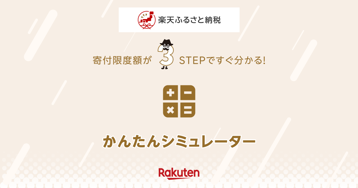 楽天のふるさと納税のページに、納付額の限度額の目安を知れるシミュレーターがあります。簡易版と詳細版の2つがあります。お手元に源泉徴収票など、あなたの収入の詳細が分かる資料があれば詳細版で、なければ簡易版でシミュレーションしてみましょう。もちろん詳細版のほうが高い精度でシミュレーションできますが、簡易版でも大まかな把握には十分です。